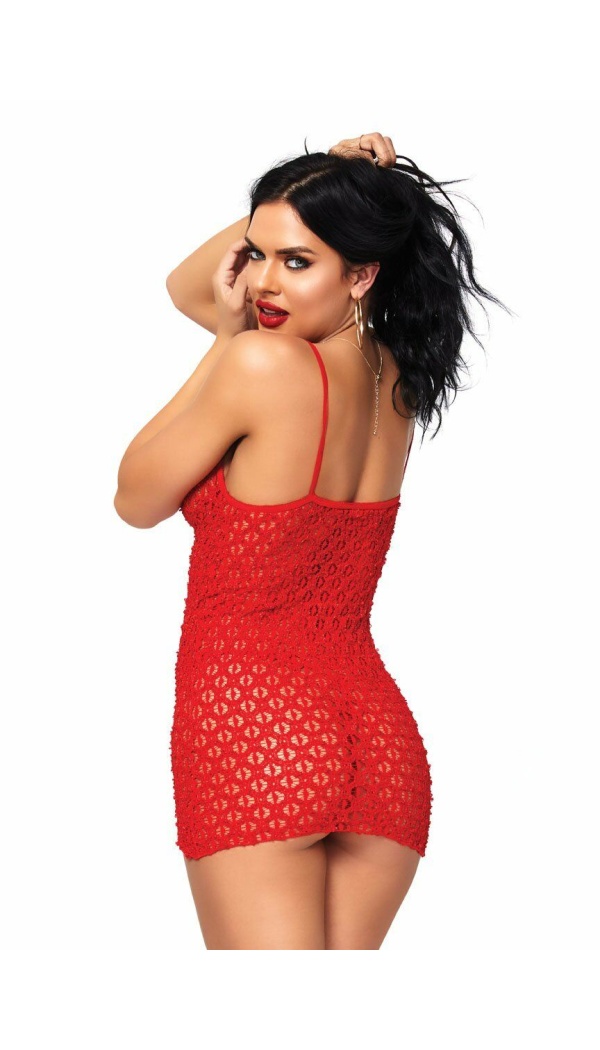 Punast värvi seksikas venivast pitsist minikleit, mille juurde komplekti kuuluvad ka napid stringid.