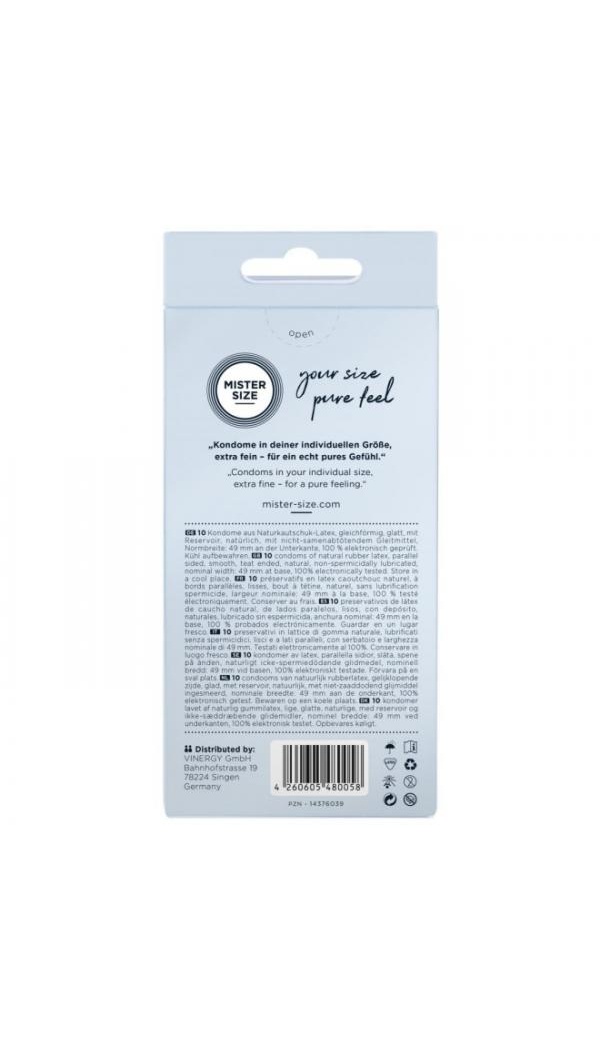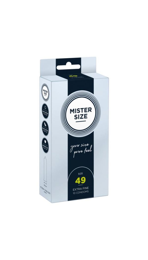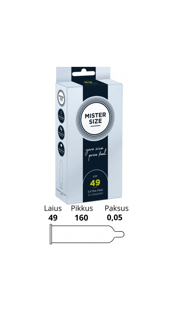 Mister Size 49mm on soovitatav peenisele ümbermõõduga 10 kuni 11cm . Kondoomi laius on enesetunde jaoks kõige olulisem. Õige Mister Size kondoomi kasutamine annab teile parema tunde ja tunnete end turvalisemalt, kuna kondoomil on optimaalne sobivus. Mister Size kondoomid pakuvad hõlpsat lahtirullimist ja sobivad ideaalselt. Mister Size latekskondoomid on sirge kujuga, läbipaistvad, libestatud ja otsas reservuaariga. Väga õhukesed - paksus vaid 0.050 mm.