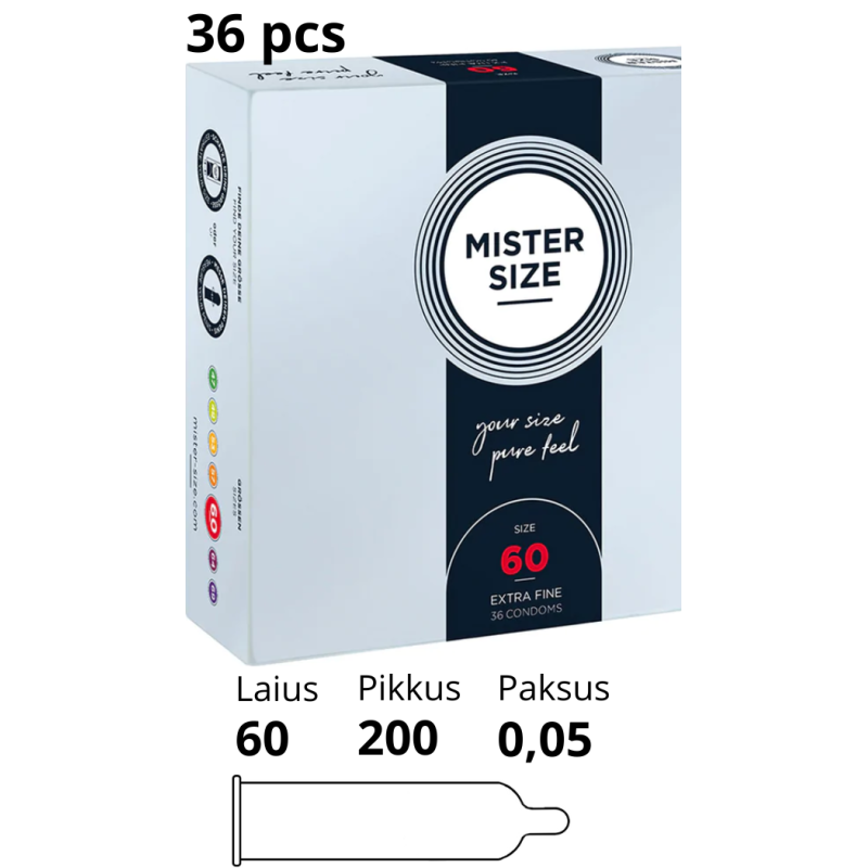 - Individuaalne sobivus: MISTER SIZE pakub 7 erinevat suurust, et igaüks leiaks endale sobiva kondoomi.