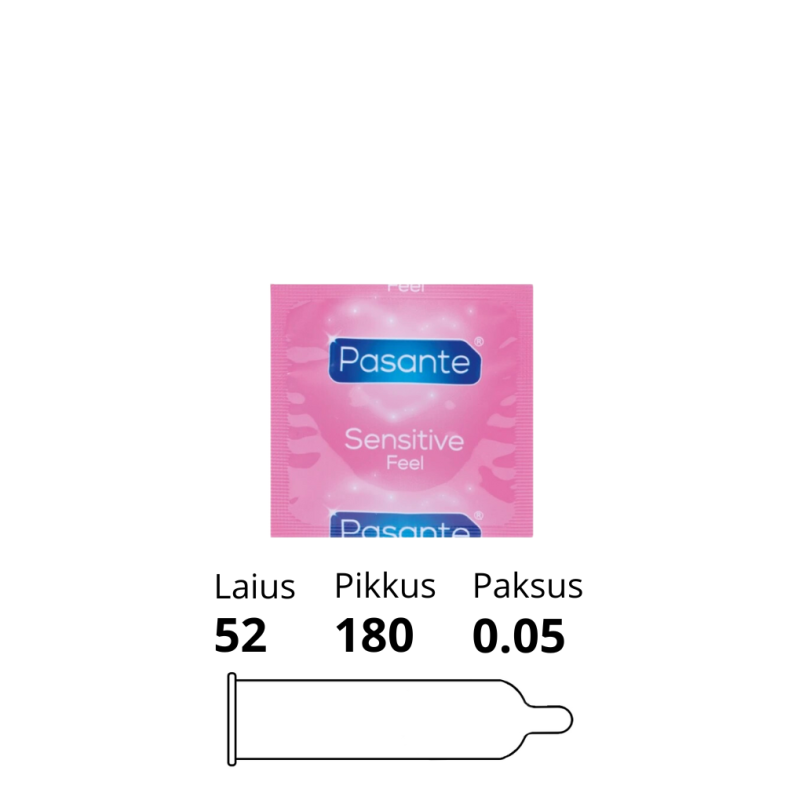 Pasante Sensitive kondoomid on üliõhukesed väga lädedaseks kontaktiks. Sile, sirge, loomulikku värvi ja reservuaariga. Kondoomi paksus on 0,053 mikronit, mis on kuni umbes 25% õhem kui tavalised kondoomid.
