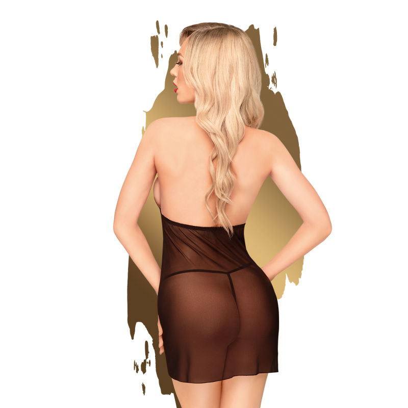 Pitsilise rinnaosaga, läbipaistvast võrkkangast babydoll, mille juurde kuuluvad ka stringid.