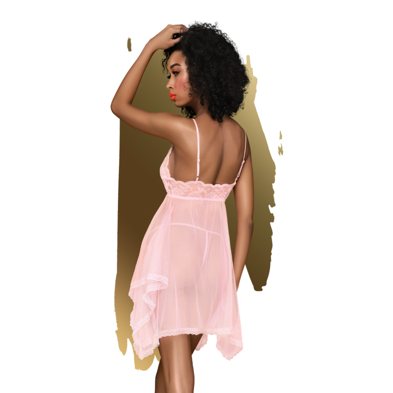 Pitsi detailidega kaunistatud, asümmeetrilise seelikuosaga babydoll sobivate stringidega.