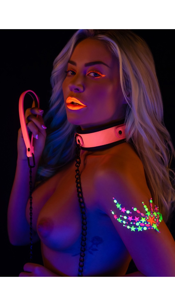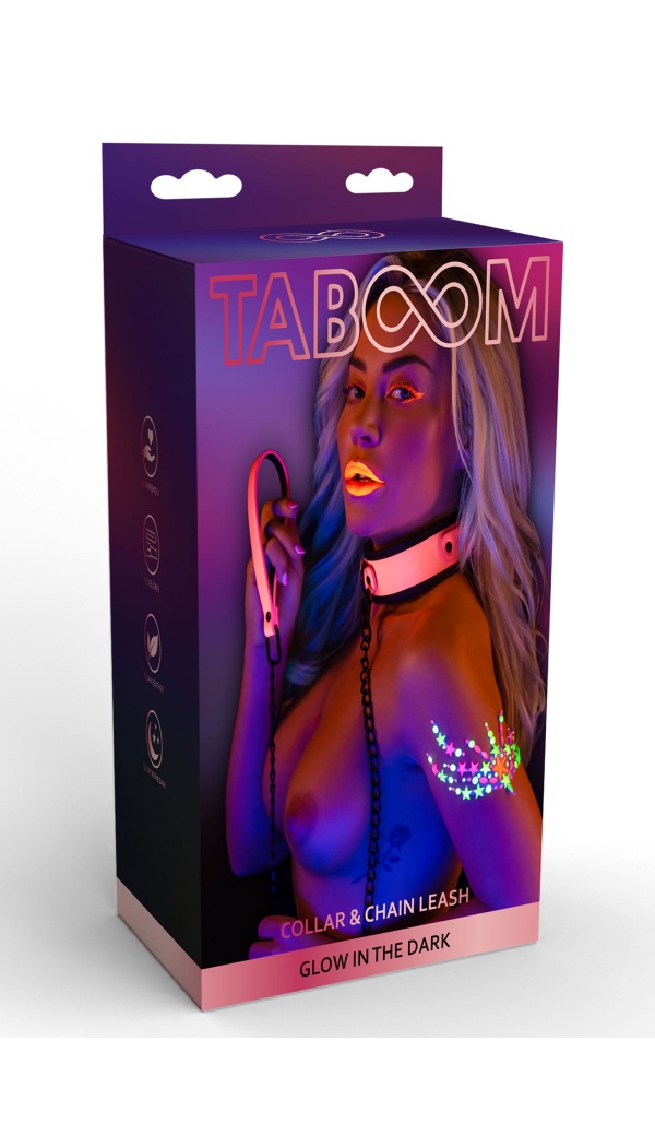 Explore your kinky side! Use the TABOOM GLOW IN THE DARK COLLAR & CHAIN LEASH in the bedroom, hotel room, play party or kinky club. Let your trusted dominant control you by pulling you around. The easy-to-use Collar & Chain Leash are made of high-quality materials and are perfect for an excellent BDSM session. Or wear it as a sexy fashion statement. Get ready for an enlightening bondage experience with the vegan leather collar & chain leash.