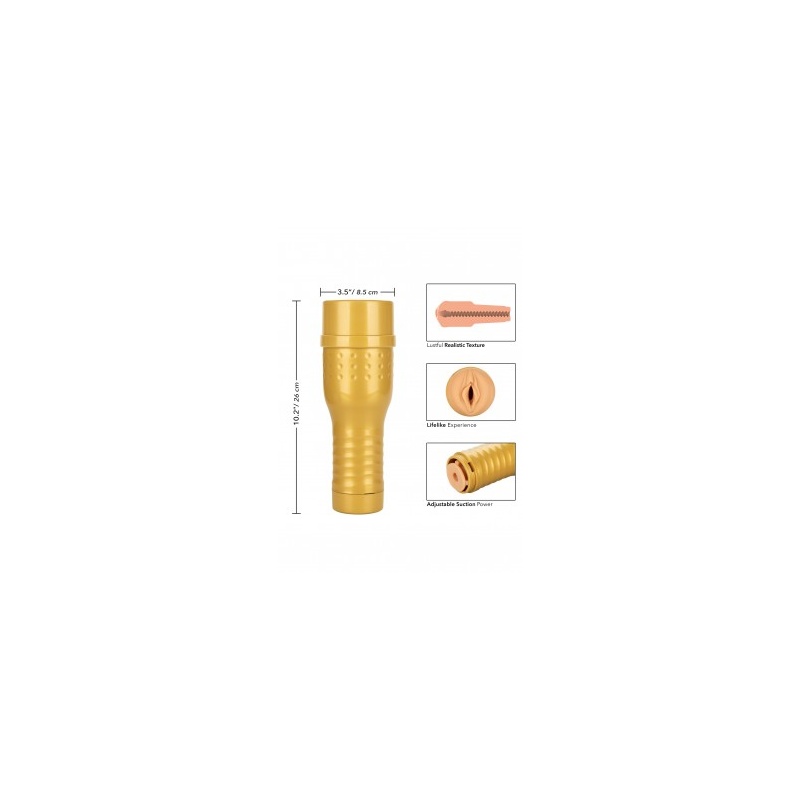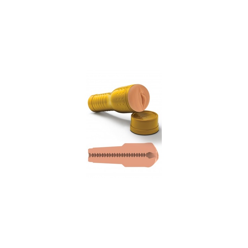 Vagiina on disainitud diskreetsesse, taskulambi kujulisse hoidikusse, mis on valmistatud kullavärvi plastikust.