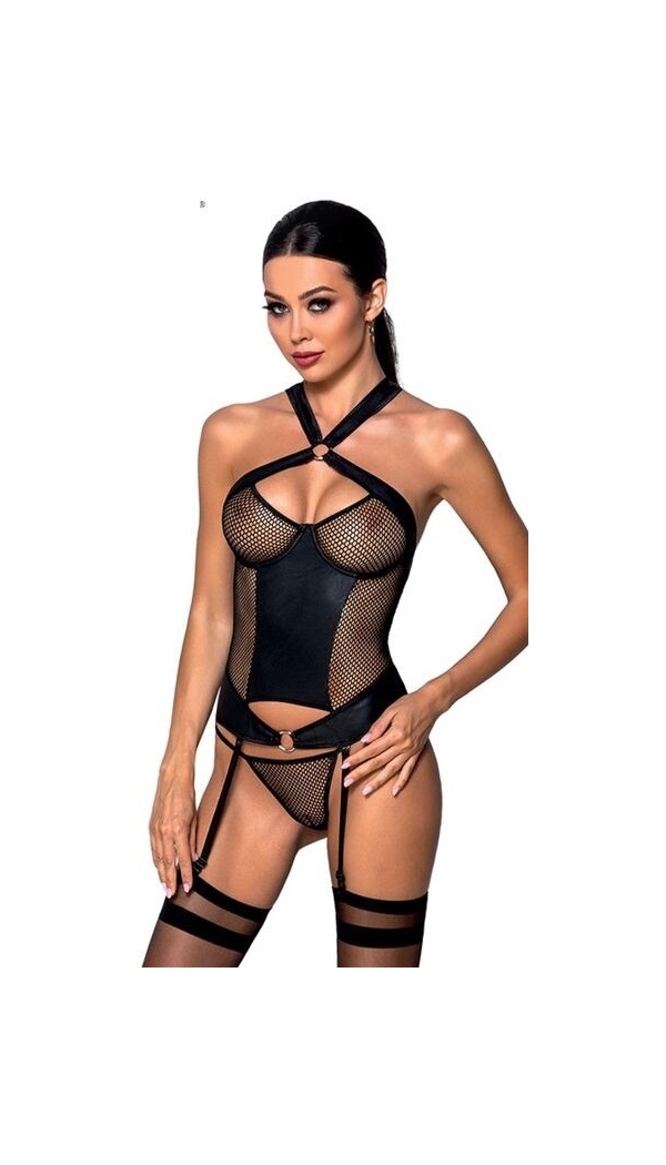 Kaunilt läbikumav võrgu ja kunstnaha kombinatsioonis korsett, millel on küljes eemaldatavad sukatripid. Komplektis ka võrkriidest stringid.