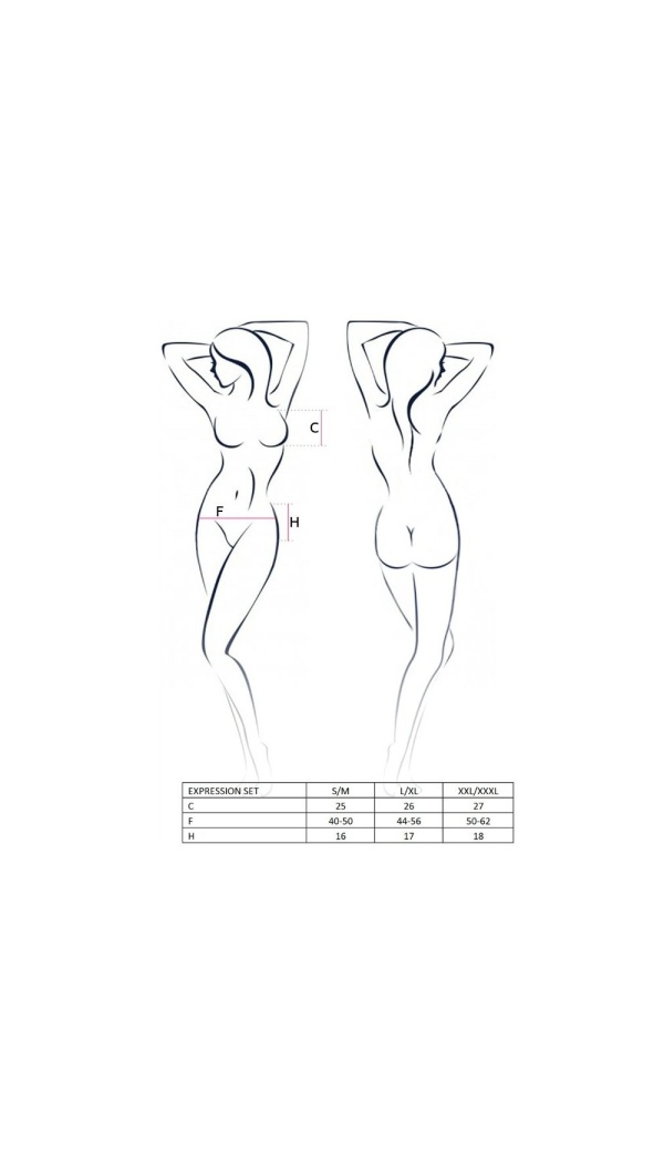 Komplektis on rinnahoidja (tagant kinniseotav), ümber puusade lühike seelik ja stringid.