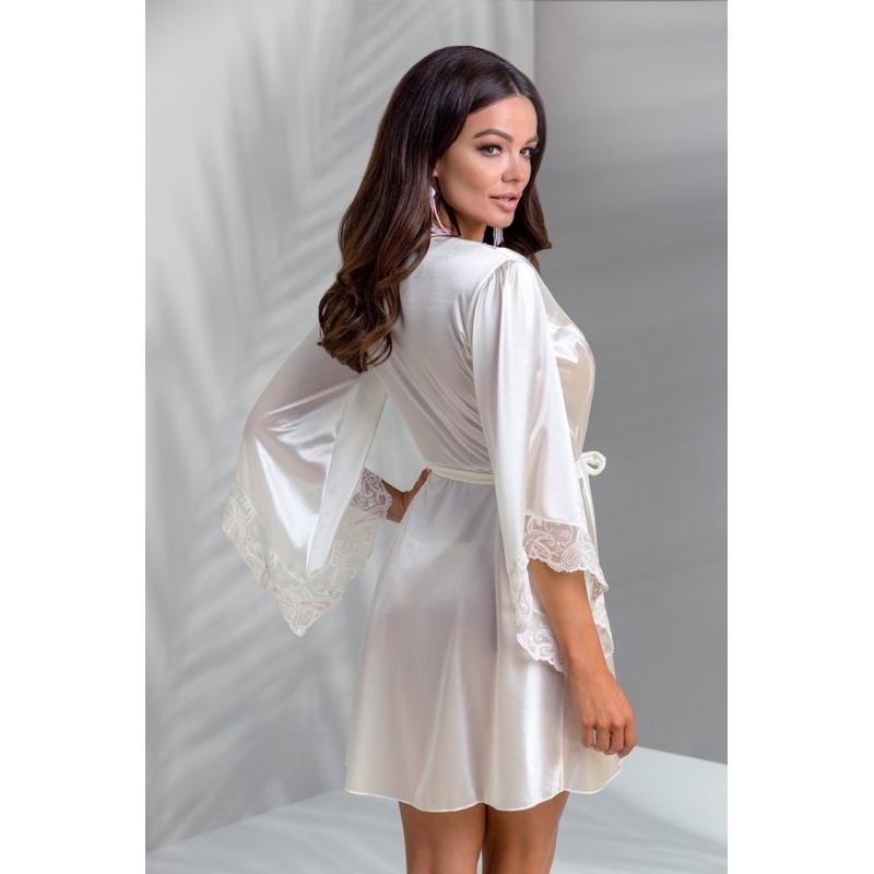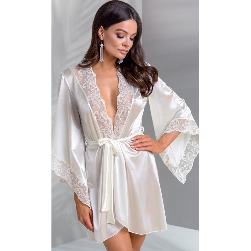 Elevandiluuvärvi satiinist lühike vööga hommikumantel kauni, läbipaistva kašmiirpitsiga rinnal ja käiste otstes. Kaasas sobivad stringid.