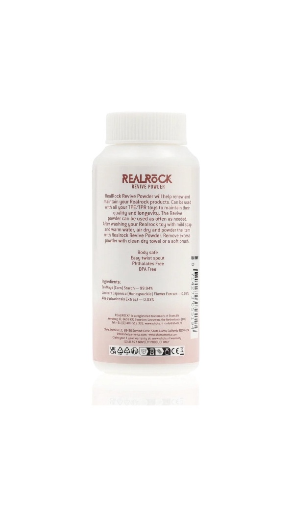RealRock Revive Powder помогает поддерживать и продлевать жизнь вашим игрушкам из TPE и TPR. При регулярном применении он восстанавливает их бархатистую текстуру, защищает от липкости и пыли, сохраняя поверхность приятной на ощупь и максимально похожей на кожу.