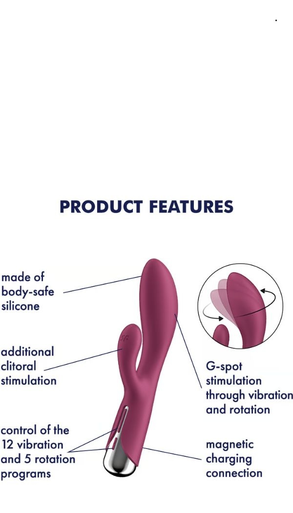 Kas soovid samaaegset kliitori ja G-punkti stimulatsiooni? Siis on jänkuvibraator just sulle sobiv. Kas soovid ka rohkemat kui lihtsalt vibratsiooni? Siis luba meil tutvustada Satisfyer Spinning Rabbit 1-te, mis ühendab vibratsiooni ja pöörlemise kõige kuumemal viisil. Lisaks 12 intensiivsele ja vaheldusrikkale vibratsiooniprogrammile ootab sind selle jänkuvibraatoriga 5 täiendavat pöörlemisprogrammi, igaüks päri- ja vastupäeva. Nagu jänkuvibraatorite puhul ikka, sisestad Satisfyer Spinning Rabbit 1-e varre, et hellitada oma G-punkti seestpoolt. Sa ei pea valima pöörlemise ja vibratsiooni vahel, sest kahte funktsiooni saab juhtida koos või eraldi. Väike kliitoristimulaator asub samal ajal sinu pärlil ja stimuleerib seda väljastpoolt intensiivsete vibratsioonidega. Pane tähele, et pöörelda saab ainult vars, mitte kliitoristimulaator.