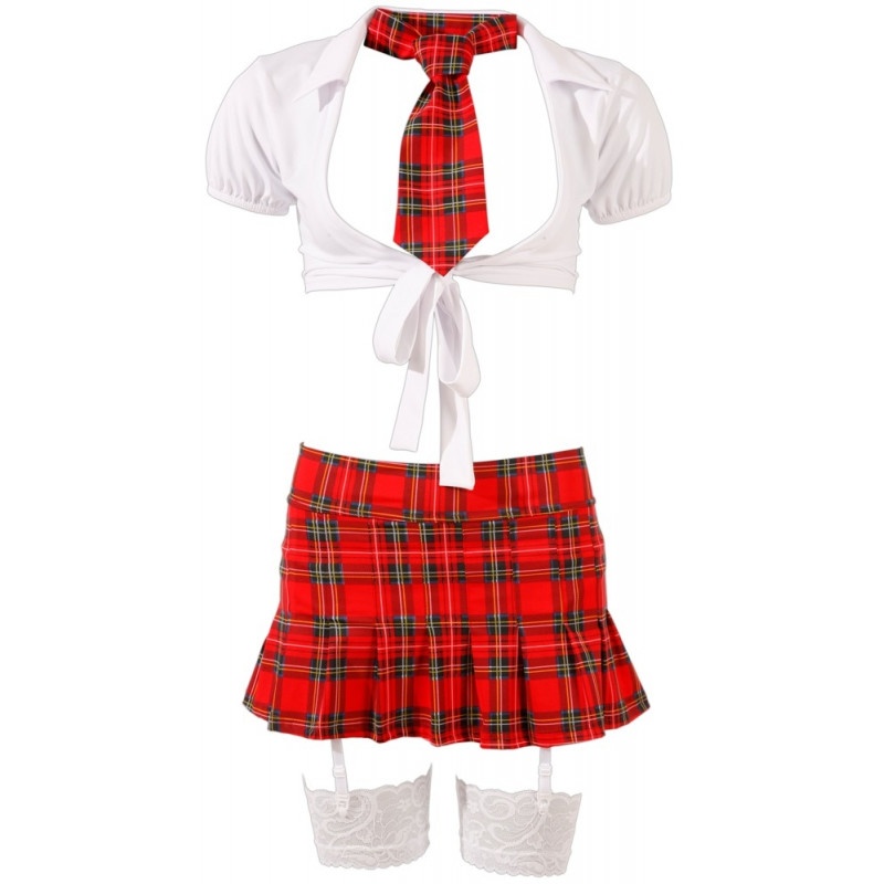 Lühike pluus, mida saab eest kokku siduda, plisseeritud miniseelik, mille tagaküljel põnev avatud lõige, kust avaneb suurepärane vaade armsatele satsilistele püksikutele ja nende külge õmmeldud reguleeritavatele sukatrippidele. Seelikul on tagaosas lukk.