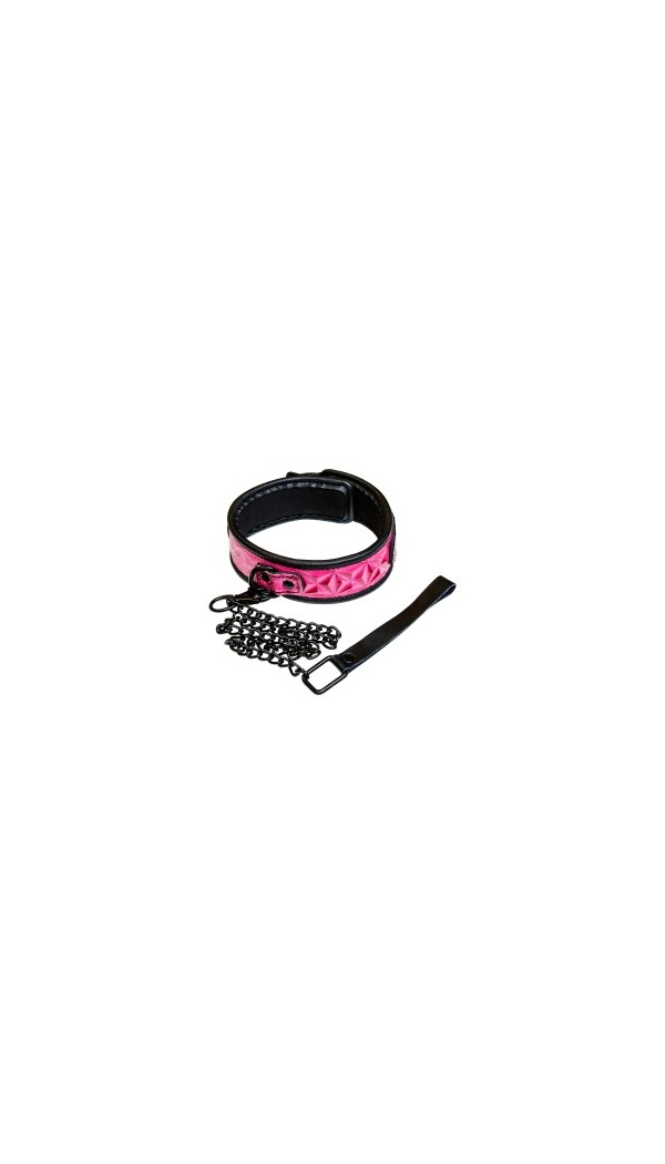 Pealt kauni mustriga ja seestpoolt pehme kangaga kaetud kaelarihm niklivabast metallist jalutusketiga.