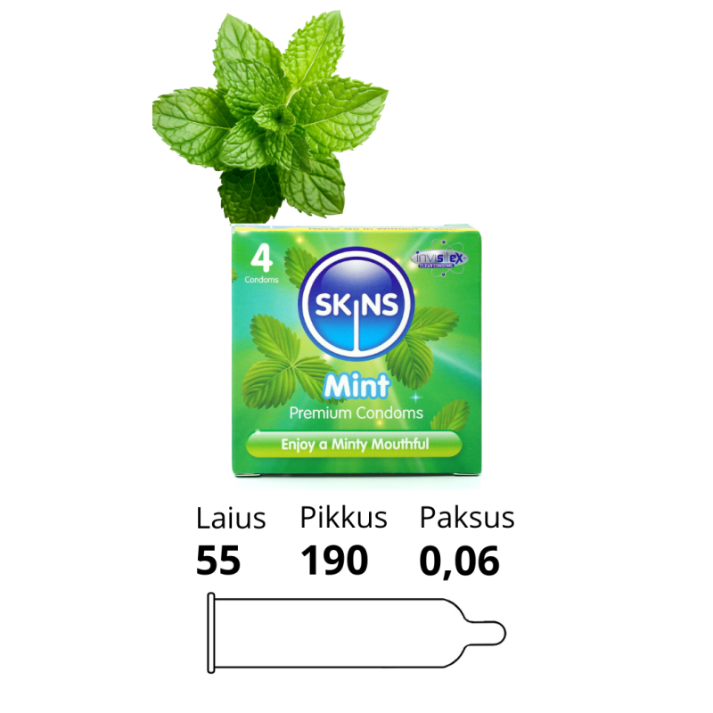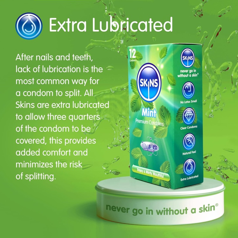 Skins Mint kondoomid on loodud, et pakkuda loomulikku tunnetust ja turvalist kogemust, ilma et peaksite nautimisest loobuma. SKINS kondoomil ei ole lateksilõhna ning see on mugavamaks kasutamiseks lisamäärdeainega kaetud. Valmistatud parima kvaliteediga looduslikust kummilateksist, mis on saadud maailma parimatest lateksikasvatuspiirkondadest, tagavad need kondoomid kindla ja usaldusväärse kaitse.