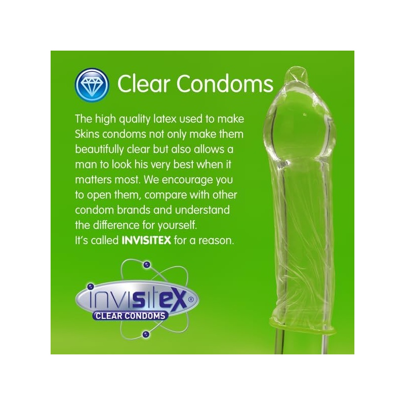 Need õhukesed ja läbipaistvad kondoomid on valmistatud Skins Invisitex-tehnoloogiaga, mis annab neile peaaegu nähtamatu välimuse ja loomuliku tunde. Kõik Skins'i maitsekondoomid on kaetud suhkruvaba maitsestatud määrdeainega, mis teeb neist parima valiku oraalseksi jaoks. Lisamäärdeaine tagab maksimaalse mugavuse ja vähendab hõõrdumist, pakkudes mõlemale partnerile meeldivamat kogemust.