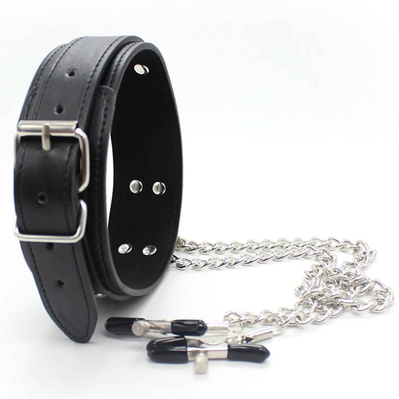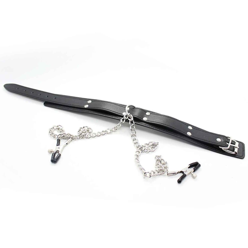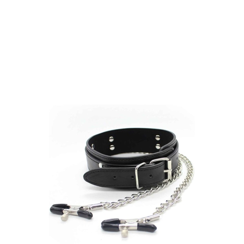 Too oma BDSM-kogemusse põnevust ja sensuaalset pinget selle elegantse komplektiga. Vastupidavast kunstnahast valmistatud reguleeritav kaelarihm on vooderdatud pehme neopreeniga. Kaelarihmast kulgeb kett otse paari metallist nibuklambrini, mille vinüülotsad lisavad mugavust ja pöidlakruvide abil saab survet reguleerida täpselt oma soovide järgi.
