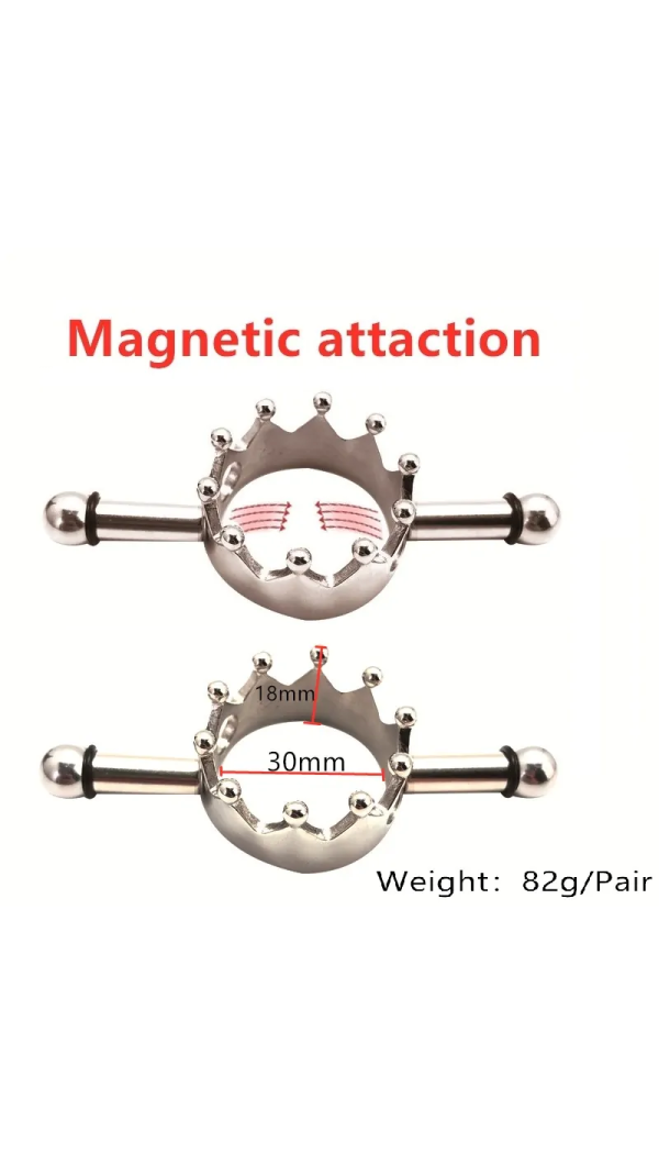Steel Magnetic Crown Nipple Clamps – kroonikujulised roostevabast terasest nibu klambrid, mis kasutavad tugevaid magneteid intensiivse surve loomiseks. Ideaalne valik stiili ja intensiivsust armastavatele BDSM-entusiastidele.