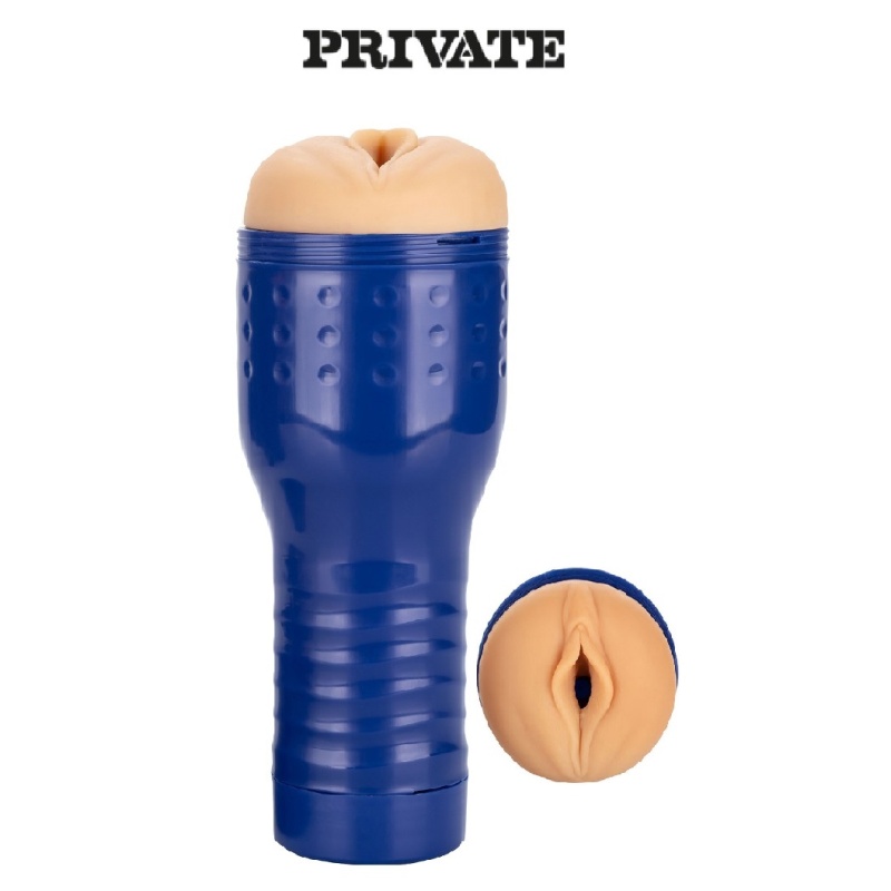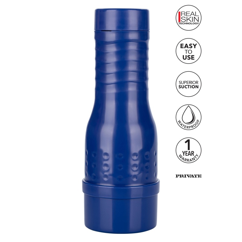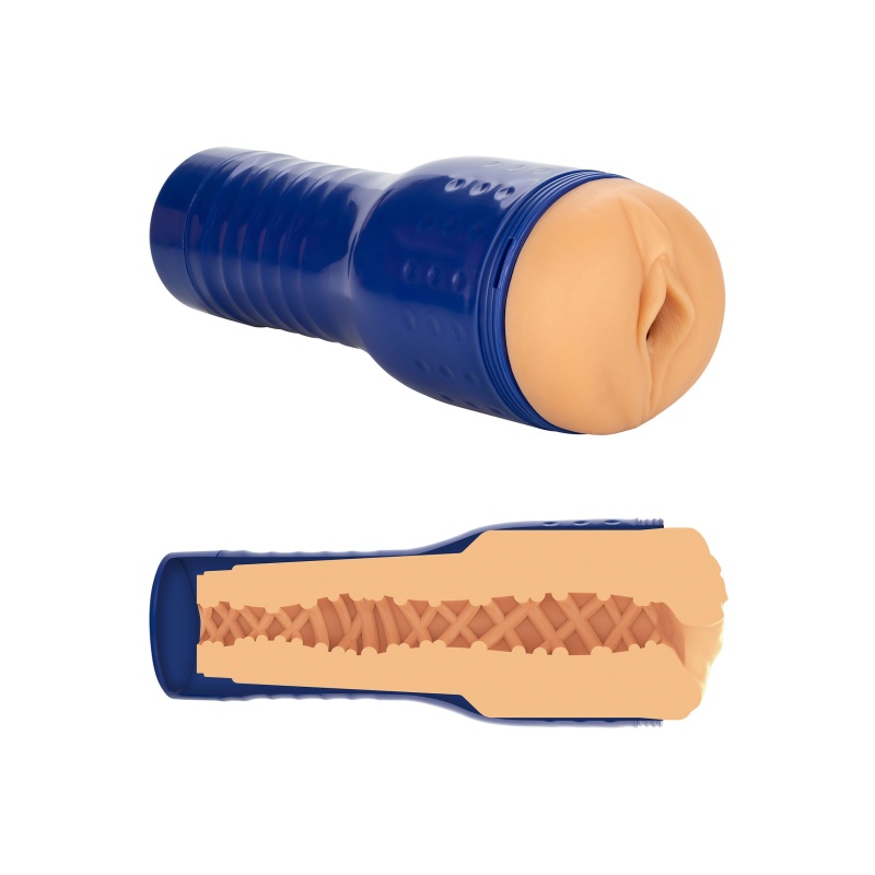 Vagiina on disainitud diskreetsesse, taskulambi kujulisse hoidikusse, mis on valmistatud sinist värvi plastikust.